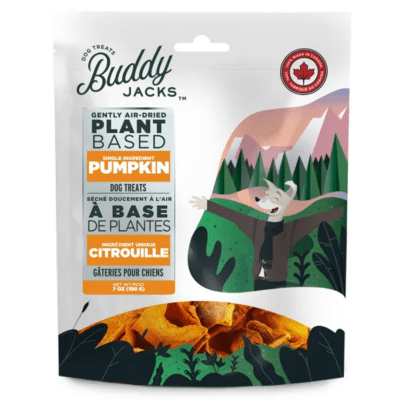Canadian Jerky Buddy Jack's Pumpkin Vegan Dog Treats are naturally grain free. Because they're free from animal proteins, they're a a safe option for dogs with allergies or sensitivities. These Canadian made jerky treats are available in 7 ounce bag.