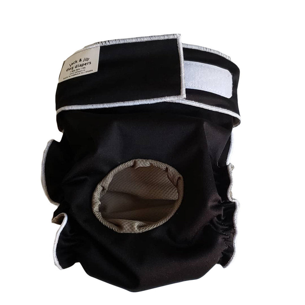 Our Doggie Diapers are stabilized with an elastic band, which affix around the rear legs and a Velcro strap is used to secure it to the dog's waist.