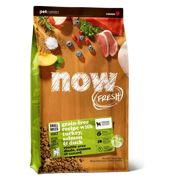NOW FRESH Small Breed Recipe for adult dogs is made simply with only the highest-quality ingredients, like fresh turkey, salmon & duck, antioxidant-rich superfoods, and pre + probiotics, with no by-product or meat meals. Thoughtfully crafted by our expert pet nutritionists, this recipe offers minimally processed, perfectly balanced nutrition to help freshen your small breed dog's breath, while supporting a healthy heart and weight.