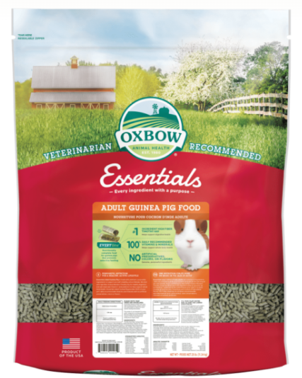- Essentials Adult Guinea Pig is made with premium, purposeful ingredients to support your pet's healthy, active lifestyle. We start with high fiber Oxbow Western Timothy hay for healthy digestion and add stabilized Vitamin C and prebiotics to help support whole body health. Essentials Adult Guinea Pig provides 100% of your pet's daily recommended vitamins and minerals with no artificial preservatives, colors or flavors.