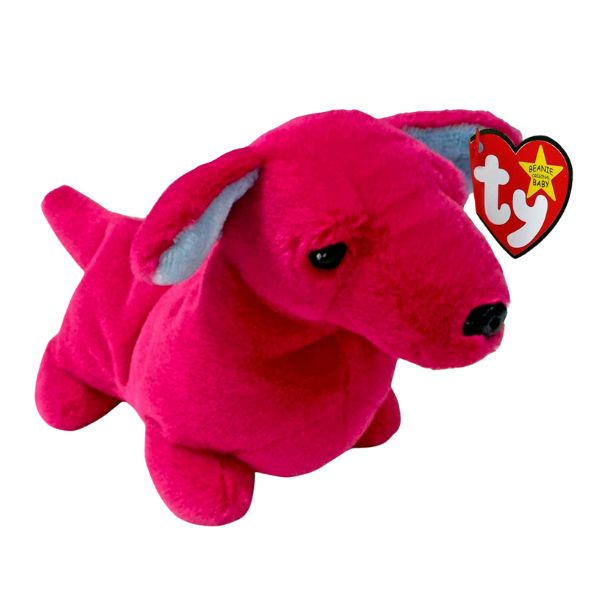Stretch is a bright red dachshund dog Beanie Baby with triangular ears and a long body. He has black button eyes and a black nose with tiny legs