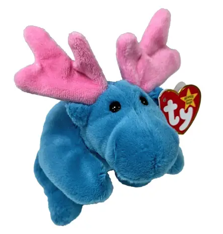 Hudson is a bright blue moose with large, pale pink antlers. He has black button eyes and tiny, blue ears. He lies flat but can be posed in a sitting position.