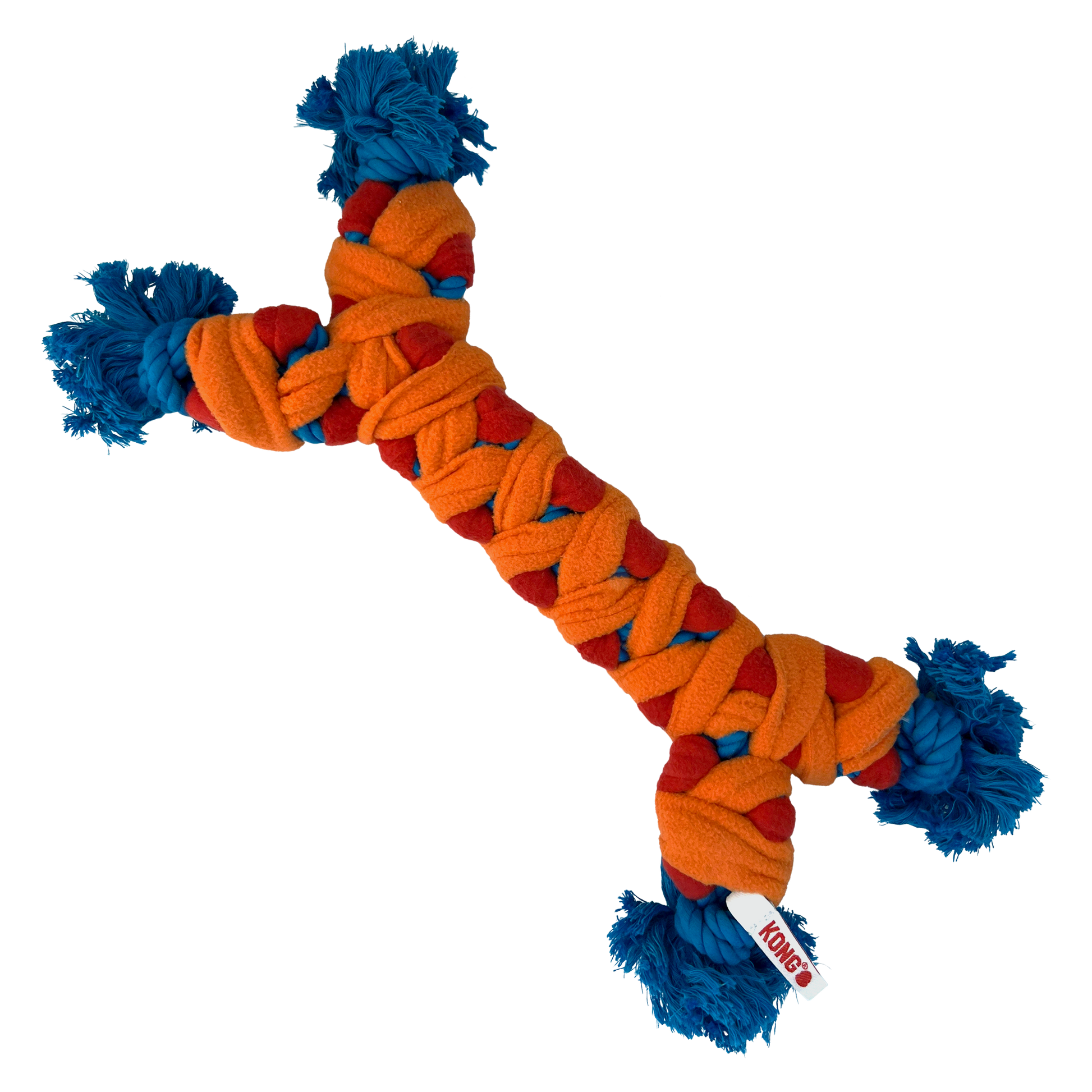 KONG Rope Rally Bone is the ideal toy for dogs who like to tug and play rough with soft toys. Strong inner core rope is woven together with a top layer of soft fleece, making the perfect interactive toy. The bone shape is ideal for shaking, fetching, and tugging. The outer fleece layer helps to gently brush dogs' teeth as they tug and bite.